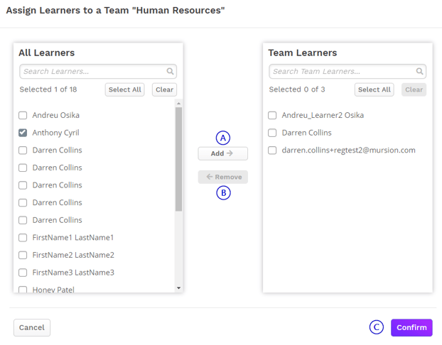 - To Add Learners to a team, select users in the left column then click Add to move them to the Team Learners column