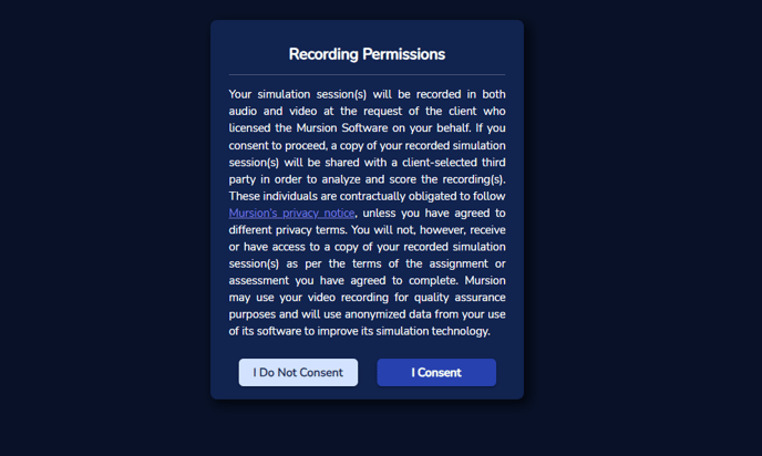 Once the devices are enabled, you will be guided to the Recording Permissions page. Select "I Consent" to record the session or "I Do Not Consent" to not record the session.