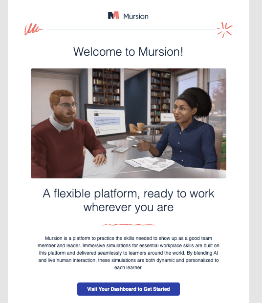 - If you have been invited to join your organization's Mursion account, you will receive an email from no-reply@mursion.com inviting you to set up your user account. The registration link found in this email is valid for 60 days. After 60 days, you can trigger a new link by attempting to reset your password.