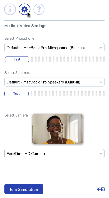 - Once you have joined the simulation, the right side-panel will allow you to select and test your Microphone and Speakers devices. To do this, click on the gear icon. The default devices will match your system's defaults initially.