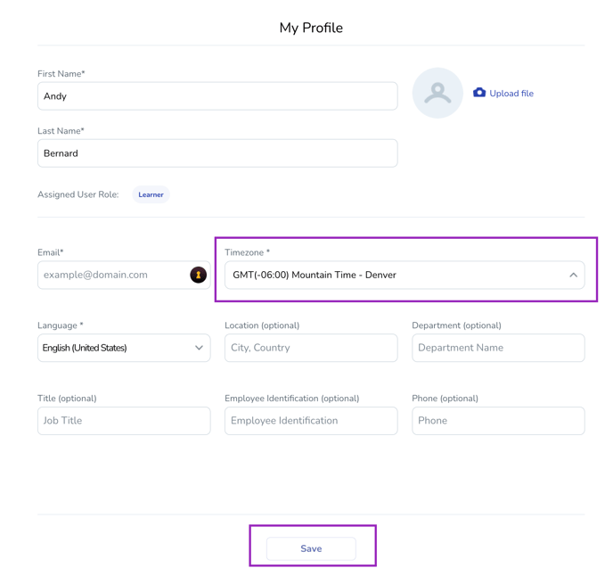 - Use the Timezone dropdown to select your time zone. When selecting a time zone in our software, it’s important to choose the option that accurately matches your location, not just the time zone name. This ensures that daylight saving time adjustments and other local time changes align correctly with your current location. If you’re unsure, please refer to your specific city or region to find the most precise match. Once you've selected your time zone, click Save to save your profile.